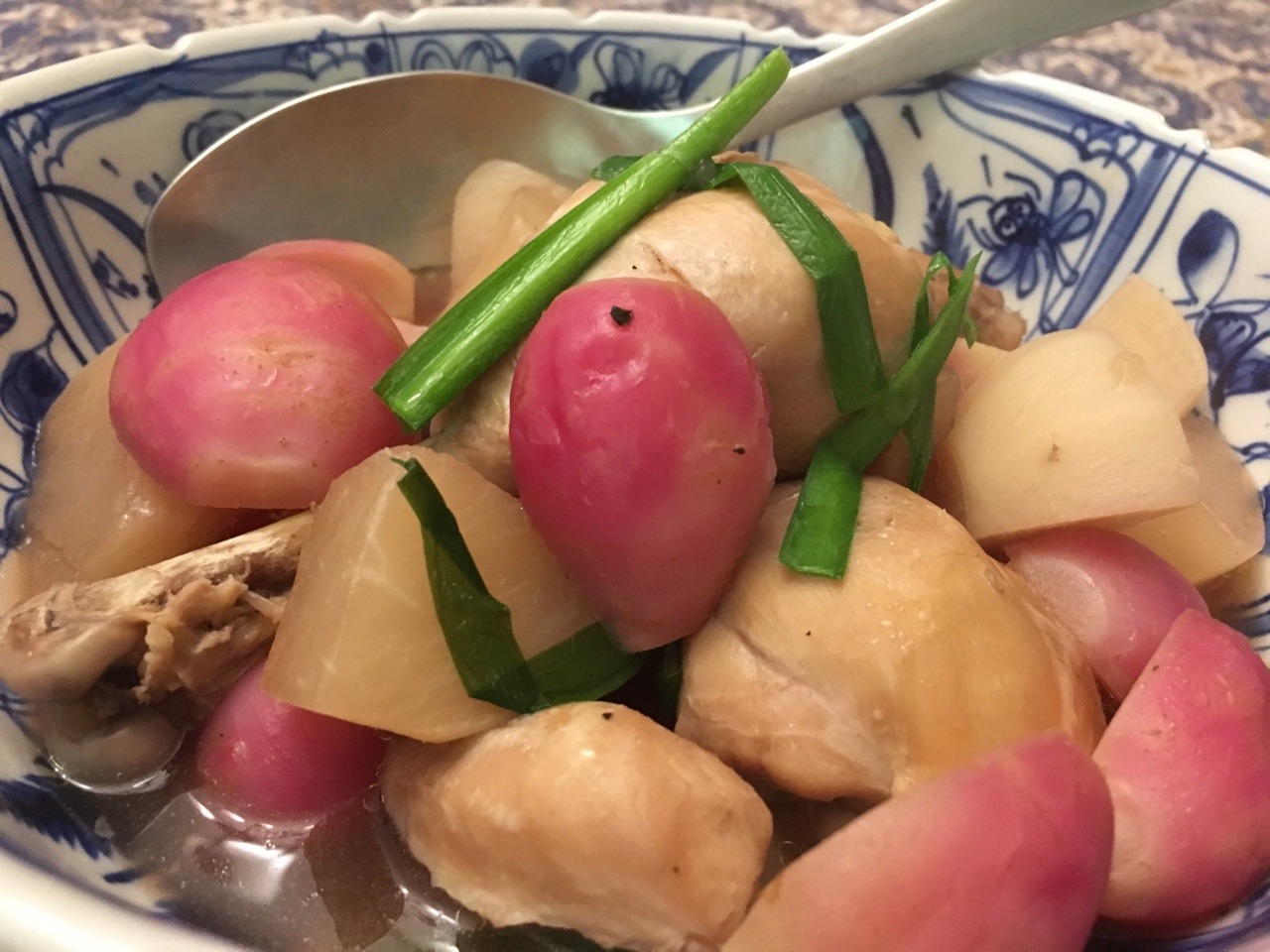We tried this recipe: https://www.cookforyourlife.org/recipes/simmered-chicken-with-daikon-radish/ Our modifications: we used 6 skinless drumsticks, 1 ½ purple topped turnips (peeled and cut into 2×2 cubes), and one bunch red radishes (trimmed and either halved lengthwise or left whole, depending on size). We added some freshly ground black pepper. To nearly cover the chicken and radish, we ended up adding 1 more cup water. (Aug. 2018)