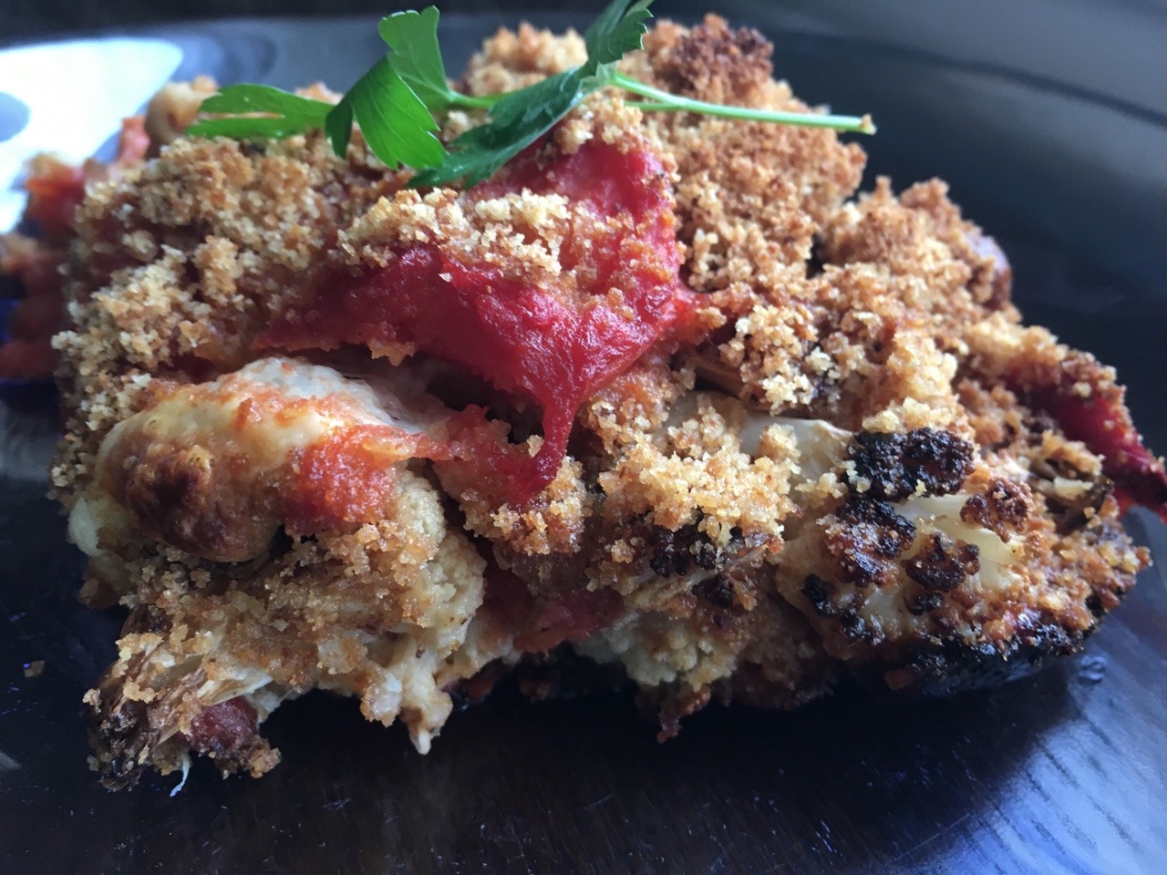 First, instead of dredging the cauliflower in egg and breadcrumbs and deep frying it, we oven-roasted the cauliflower florets (tossed in a little olive oil and sprinkled with a little salt and pepper) at 425 for 30 mins, tossing midway. Second, to mimic the breading, we lightly toasted 2 cups (not 3) plain breadcrumbs in some olive oil (about 3-4 Tbsp) in a teflon frying pan. Third, we reduced the amount of parmesan to ½ cup (from 1 cup). Finally, when assembling the casserole, we layered in this order: a) a little sauce on the bottom of the casserole dish; b) a sprinkle of toasted breadcrumbs to absorb some of the liquid from the sauce; c) ½ of the parmesan; d) half the cauliflower; e) 1/3 of the remaining breadcrumbs; and f) ½ the handtorn mozzarella. In the second round, we increased a) to 1/3 the remaining sauce and then continued b) through f). At the very end, after adding the final layer of sauce, we sprinkled the last 1/3 of the breadcrumbs and skipped the parmesan. (Aug. 2018)