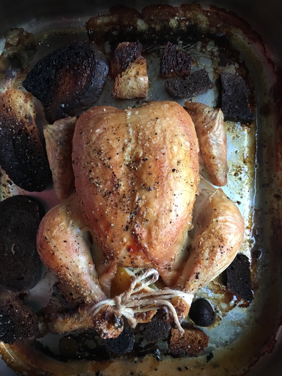 We used three types of sliced Whole Foods artisalal bread (which we bought in ½ and ¼ loaves): pain de campagne, olive, and pumpernickel. We made the fresh bread stale by following this recipe: http://piglettedc.tumblr.com/post/176915166141/quick-method-for-making-bread-stale-we-needed To line the bottom of our roasting pan, we needed about ¾ of an entire loaf. We used our sturdy, heavy All-Clad roasting pan but found that almost all pieces of bread turned to carbon at 425. It was very disappointing. We were able to salvage about 1/3 of the bread from the roasting pan. We may try this at 375 the next time. To ensure the chicken was fully cooked, after roasting for 1 hour 15 mins, we turned off the heat, removed the burnt bread, and then let sit in the oven’s residual heat for about 20 mins. (Aug. 2018)