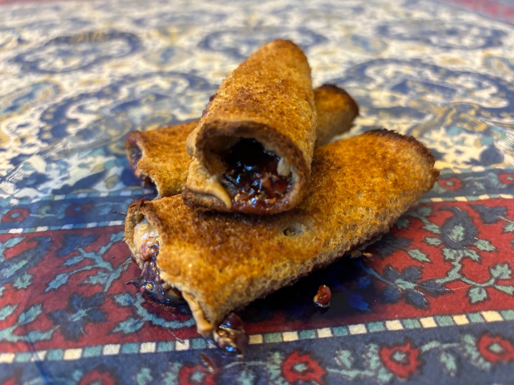 This is a recipe from my childhood: a home economics class in middle school. I tracked down the same recipe here: https://dancingthroughtherain.com/peanut-butter-and-jelly-rollups/ We used leftover slices of whole wheat bread, room temperature unsalted butter, smooth peanut butter, and homemade Concord grape jam. Because we didn’t have toothpicks, we placed the roll-ups seam-side down and slightly flattened the roll against the foil (which we used instead of parchment). (Dec. 2019)