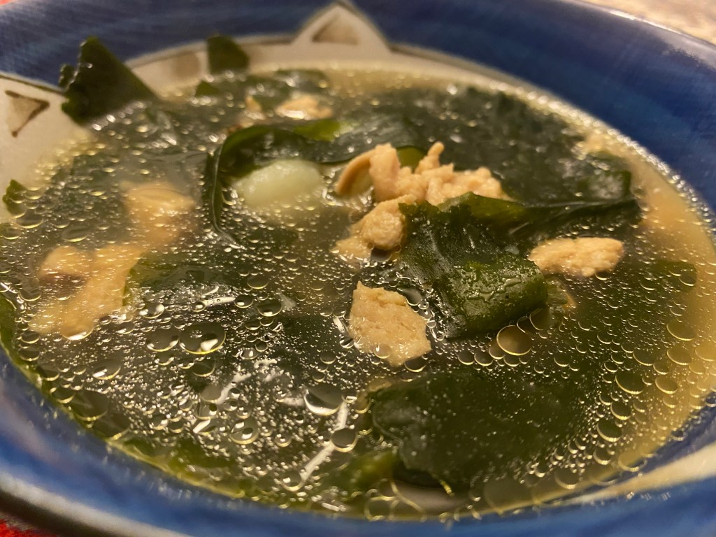 We made this on the fly: first, soak about ½ oz dried wakame, broken into 1″ shards (about 1.5 dry cups) in room temperature water for 30 mins; leave soaked until ready to use. At the same time, soak 7-8 dried shiitakes in hot water for 20-30 mins; drain, trim off and discard stems, and cut the mushroom caps into small dice (see Note below). Reserve the mushroom poaching liquid (about 1.5 cups) and set aside. Second, saute ½ lb minced pork (or minced chicken) in a medium Dutch oven until lightly browned. Add finely diced shiitakes and saute for 1 min. Add 6 minced garlic cloves, then add 8 cups liquid (1.5 cups mushroom poaching liquid and 6.5 cups hot water). Bring to a boil, reduce to a simmer, and add 1 Tbsp fish sauce, 1.5 tsp soup soy sauce, and 2 mounded Tbsp (common utensil, not measuring spoon) of Korean beef boullion (sogogi dashida). Stir, then add the wakame without soaking liquid (I use chopsticks to remove the wakame from the liquid). Cover and simmer for 10 additional mins. Season to taste with black pepper. Serve with rice. (May 2021)