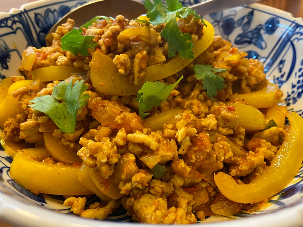 We tried this recipe: https://cooking.nytimes.com/recipes/1023125-keema-shimla-mirch-ground-chicken-with-bell-peppers?smid=ck-recipe-iOS-share We followed the recipe exactly, including the order of cooking the aromatics, chicken, and spices. We used yellow bell pepper. This was very tasty. (Apr. 2022)