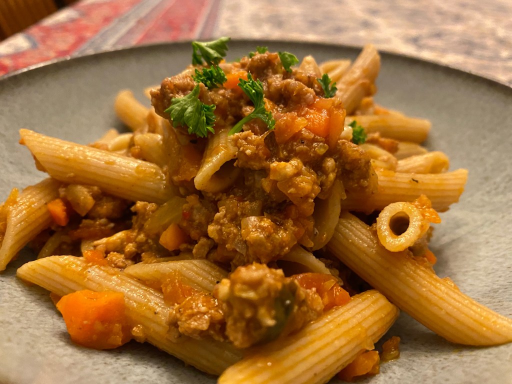 We found this recipe that uses store-bought marinara as a base: https://themodernproper.com/easy-bolognese Our modifications: first, for meat we used 1 lb minced beef and 1 lb minced chicken. We also used 24 oz Rao’s marinara sauce. Second, instead of heavy cream, we added 2 Tbsp unsalted butter at the end. Finally, we found the sauce lacking depth, so towards the end of cooking we added 2 tsp Worchestershire sauce, 2 tsp balsamic vinegar, 1 Tbsp black olive tapenade, and 1 tsp crushed red pepper flakes. (May 2022)