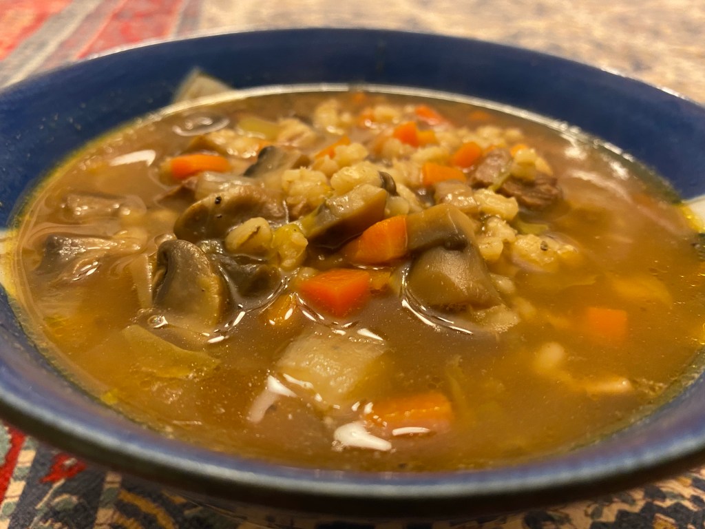 We had about 1/3 lb leftover flat iron steak. We made this recipe: https://www.tasteofhome.com/recipes/mushroom-barley-soup/ Our modifications: first, we increased the liquid to 7.5 cups beef stock (4 cups no-salt beef stock plus 3.5 cups Better Than Bouillon beef broth). Second, we added a bay leaf to the simmering period. Third, we found that the soup needed to be simmered for only one hour. (July 2022)