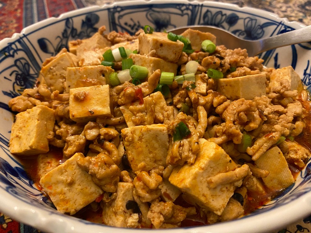 Cut 14 oz firm tofu into ½” dice, soak in boiling water for 15 minutes, and then drain and set aside, reserving 1 1/3 cups of the tofu water for later use (see Note below). Separately, toast ¾ tsp Sichuan peppercorns until fragrant, then grind and set aside. In the same wok, heat 2 Tbsp vegetable oil in medium heat, then saute about 1 lb minced chicken (if the chicken releases a lot of liquid, I recommend sopping up the liquid with a dry paper towel and adding 1 tsp oil to mimic the fat that pork would have released). When fully cooked, add 2 1/4 (possibly 2 1/2) Tbsp Pixian chile bean sauce, 1 scant Tbsp Chinese fermented black beans (rinsed and drained), 1 tsp microplaned ginger, and a dash of crushed red pepper. Cook on medium for a few minutes, stirring frequently, then add 1 1/4 tsp sugar and 2 tsp soy sauce. Mix well, then gently fold the tofu cubes into the sauce. Add the reserved tofu water, then let cook on medium-low heat until tofu cubes absorb the sauce (about 3 mins). Season to taste with salt or sugar (I added a bit more sugar), then add 2 chopped scallions. Season to taste (for ex, if too salty, add a few tsp of water). Add some cornstarch mixed with water into a slurry (here, about 1 Tbsp cornstarch mixed with 2 Tbsp cold water) until the sauce is slightly thickened, but still soupy. Sprinkle crushed Sichuan peppercorn overtop and then mix. Serve with jasmine rice. (Originally posted May 2014, then recreated in Aug. 2022)