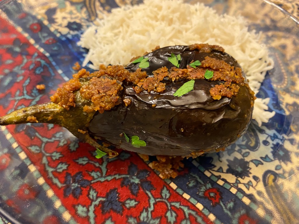 We served with basmati rice. This was tasty, and one stuffed eggplant alone was fairly rich and filling. (Aug. 2022)