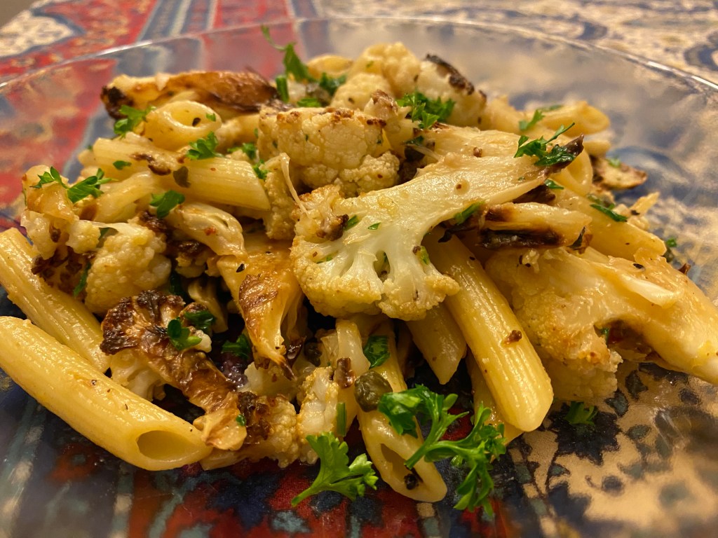 We tried this recipe with Sicilian flavors, and it was delicious. https://www.foodandwine.com/recipes/pasta-roasted-cauliflower-and-crispy-capers Because its flavor base includes anchovy filets in addition to lemon zest, capers, and pecorino, this recipe is not vegetarian. (Dec. 2022)