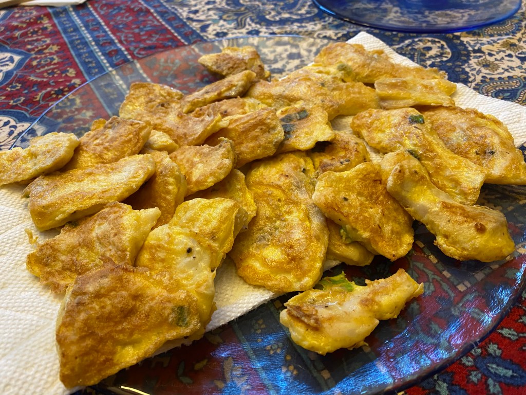 Our modifications: first, we seasoned the flour with 1/2 tsp Korean beef soup stock powder (sogogi dashida). Second, we added 1 Tbsp minced scallion to the egg mixture for flavor and color. (Dec. 2022)
