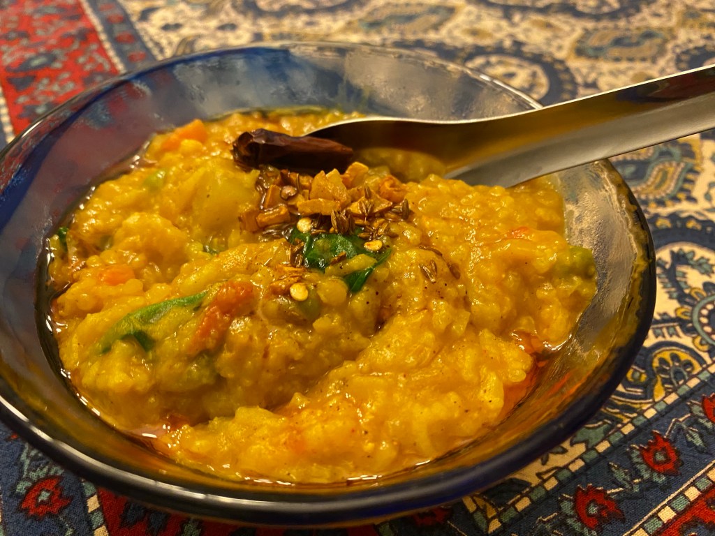 Variation (shown in photo): first, we had moong dal (split mung beans) this time. Second, we used ground Kashmiri pepper, a type of low heat pepper, for both the kichidi and the tadka. Finally, we tossed a handful of fresh baby spinach into the kichidi right after we opened the pressure cooker from natural release. (Mar. 2023)