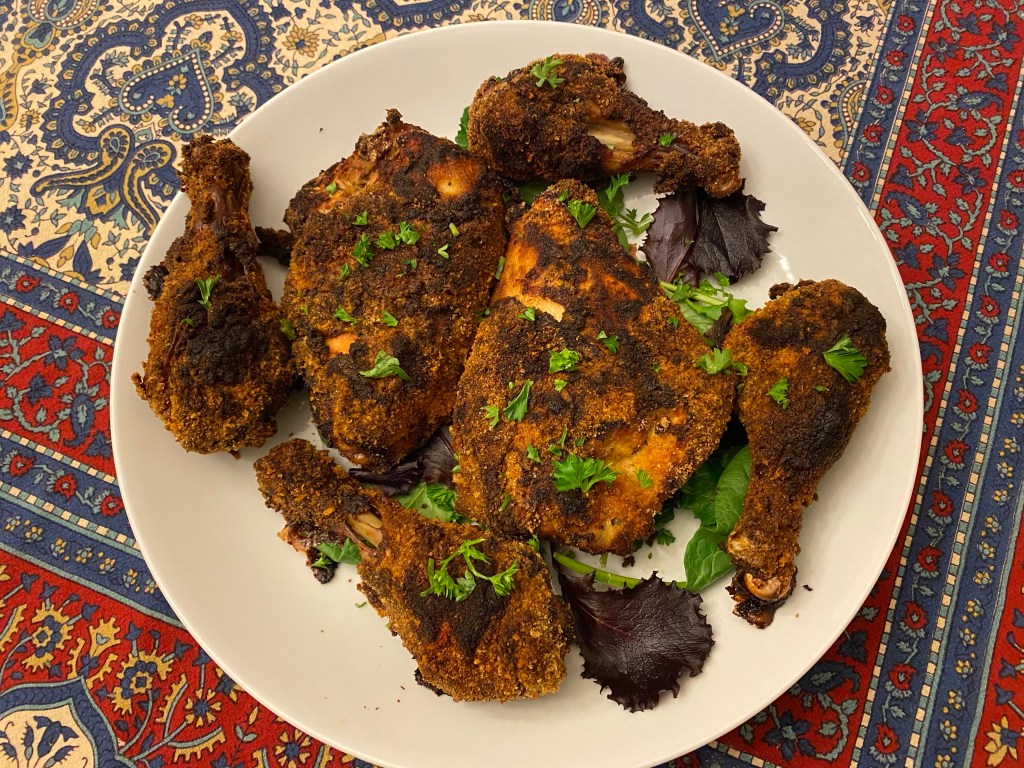 Our modifications: first, we halved the recipe, using 4 skin-on drumsticks and 2 bone-in, skin-on chicken breasts. Second, instead of mincing the garlic, we microplaned it to ensure it would be evenly incorporated into the dijon mustard mixture. Third, we did bake for nearly 2 hours at 350, but that duration may have been too long for the breading, which burned slightly. This was a delicious, albeit rich and heavy, meal for us. We served it with mashed potatoes and roasted asparagus. (Dec. 2022)