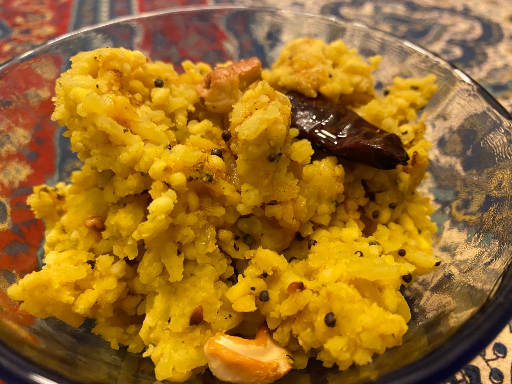 Our modifications: first, in lieu of curry leaves in the hot oil, we added 2 bay leaves to the moong dal and rice in the pressure cooker. Second, we probably had the pressure cooker on too high heat or else needed more liquid than 2 cups of water. At the end of cooking, we did a quick release but found the bottom slightly burnt and the contents dry (although the rice and moong dal were fully cooked and tender). To add back in some moisture, we added 1/2 cup hot chicken stock (we used Better Than Bouillon chicken flavor). Third, we used real ghee (not vegan) and tried to make sure the cashews were fully cooked (undercooked cashews may be difficult to digest). After stirring stirring hot oil (with black mustard seed, cashews, and dried hot peppers) into the moong dal-rice mixture, we still found the mixture dry. We then heated 2 tsp ghee, then added 1/4 tsp sweet paprika. We stirred that into the mixture. (Dec. 2022)