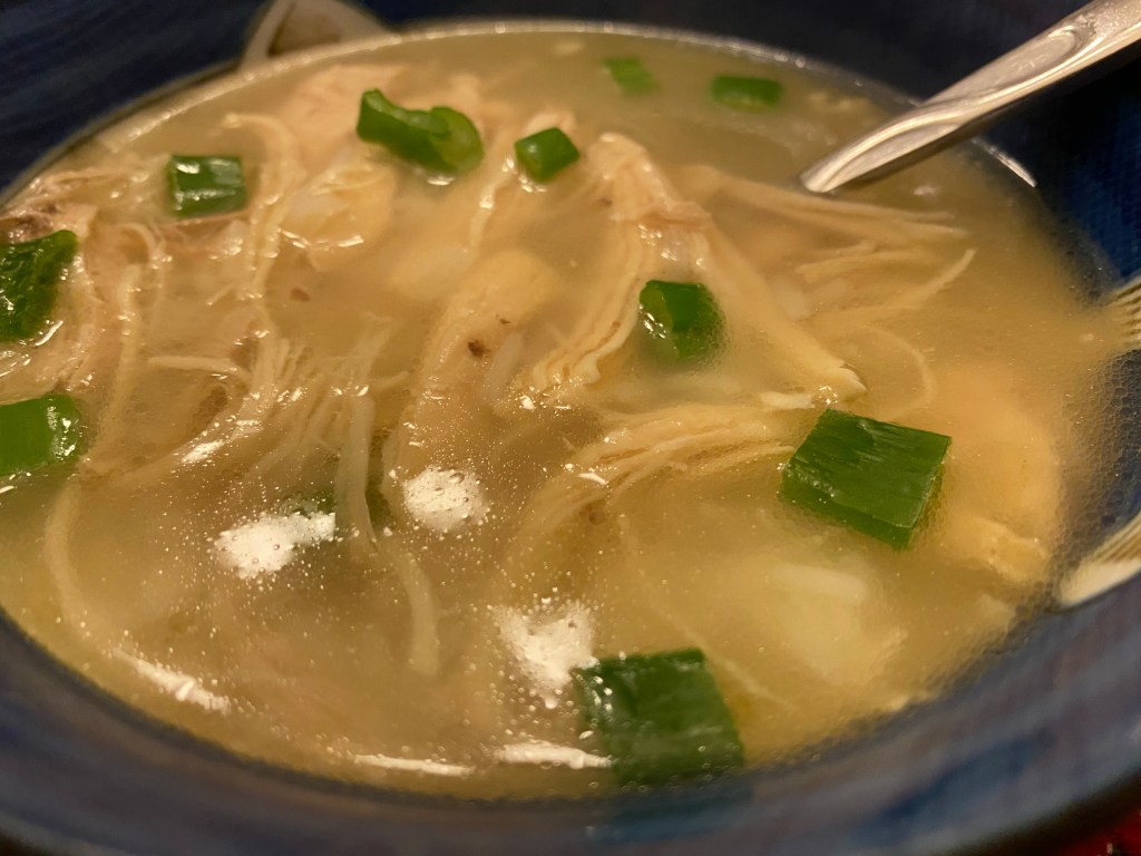 Third, remove the solids from the broth. Discard the ginger pieces, chicken bone/cartilage, and chicken skin. Shred the chicken and return to the pot. Season the broth with 2 Tbsp fish sauce, 1 tsp freshly ground black pepper, 1/2 tsp salt, and a dash of sugar as needed for balance. You can serve the soup at this stage or you can make congee.