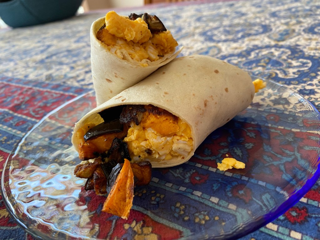 4. Assemble the burrito: distribute 1/2 of the roasted eggplant/shallot, 1/2 the roasted sweet potato/shallot, and 1/2 of the cooked scrambled egg along the midline of each tortilla, leaving about 1.5 inches from the edge empty so that you can properly wrap the burrito. (May 2023)