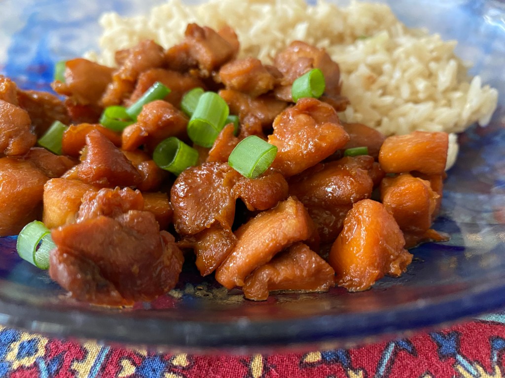 In case the link leads to a paywall, the ingredients are: 1:5 lb boneless chicken thighs (trimmed of fat and cut into 1″ chunks), 3 Tbsp bittersweet caramel sauce, 2 Tbsp fish sauce, 2 Tbsp water, a 2-inch piece of ginger (sliced into coins and lightlu smashed), and 1/4 tsp salt. You place all ingredients in one pot (we used a large All-Clad nonstick Dutch oven), cover and cook on medium for 10 mins (stirring occasionally), then remove cover and cook until sauce has reduced (about 5 mins). Leave on burner but cover pot and let sit for 5 additional mins. Garnish with chopped scallion greens and serve with rice. We found this dish a bit flat and too ginger-forward. (May 2023)
