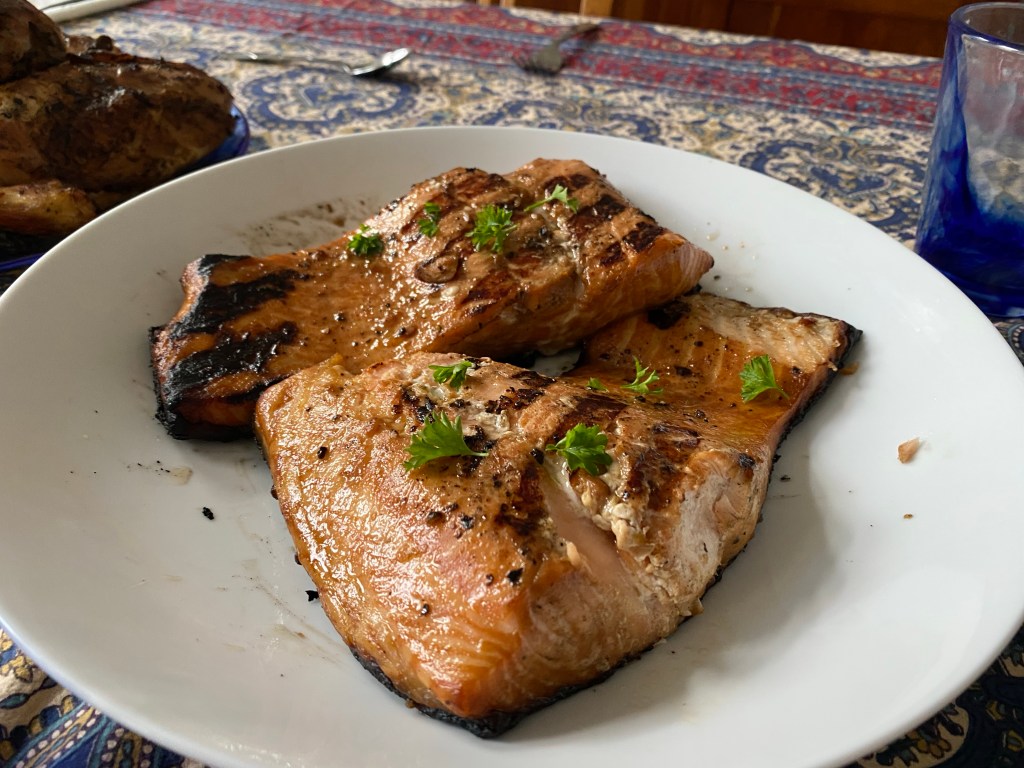 We tried this recipe for 1.9 lb salmon filet: https://www.dinneratthezoo.com/grilled-salmon/ We followed the recipe verbatim in terms of ingredient proportions, but we purposely left the herbs intact instead of mincing them (see Outdoor grilling notes below). We also cut our filet in half to make it easier to flip on the grill (and to create more surface area for the marinade to penetrate).
