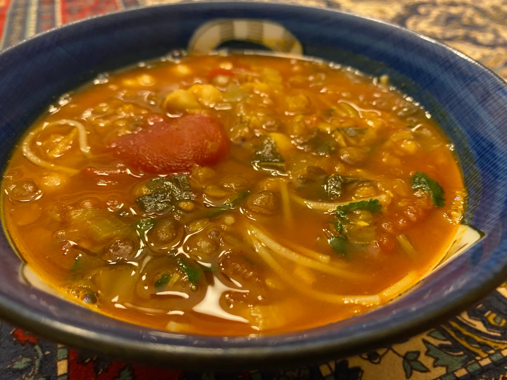 We have made harira before, but we were intrigued by this recipe’s use of two different types of lentils (red and green) plus chick peas: https://www.feastingathome.com/harira-soup/ We followed the recipe pretty closely, and it turned out well.