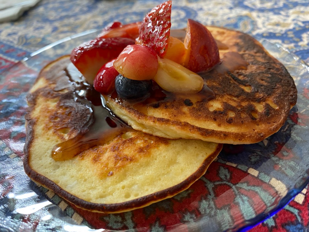 We cooked the pancakes in ghee (instead of standard butter). We served this with a simple fruit salad (summer fruit tossed with honey and lime juice). (July 2023)