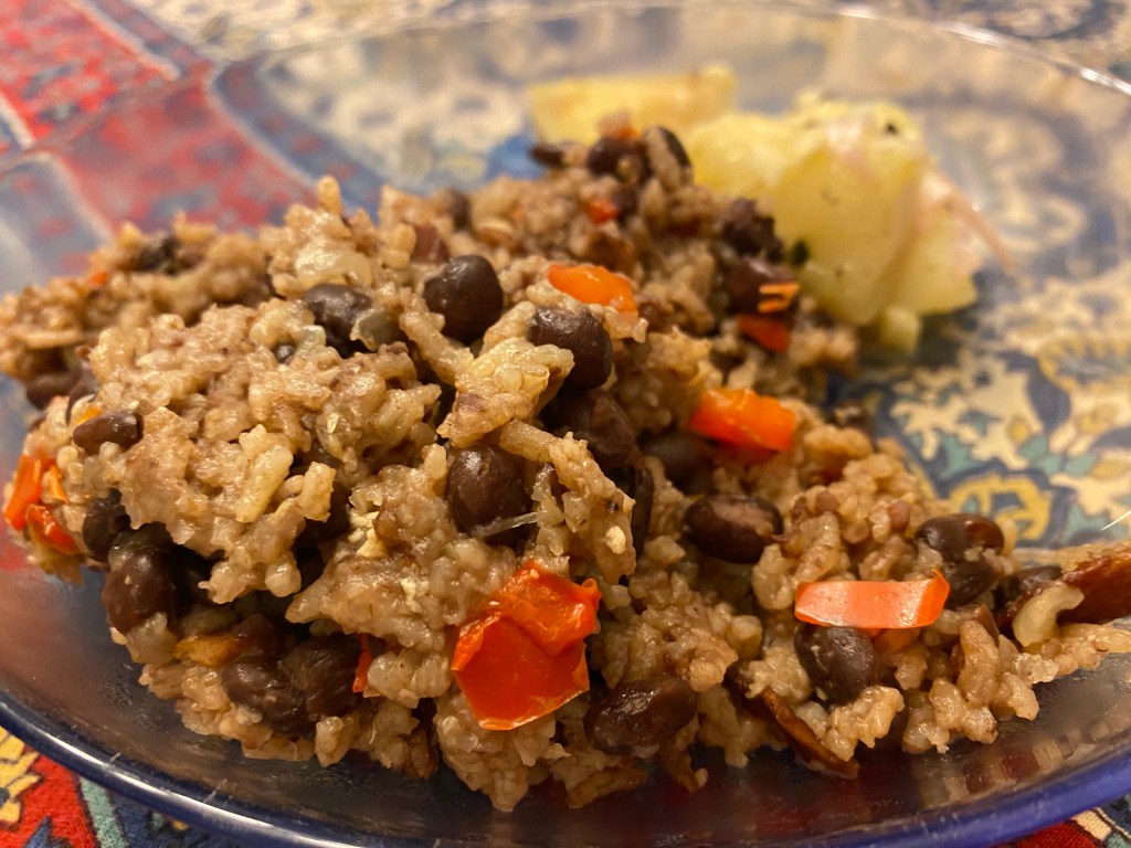 We had a craving for moros y cristianos, so we tried this recipe: https://www.chewoutloud.com/cuban-rice-and-beans-recipe/ We substituted red bell pepper for green.