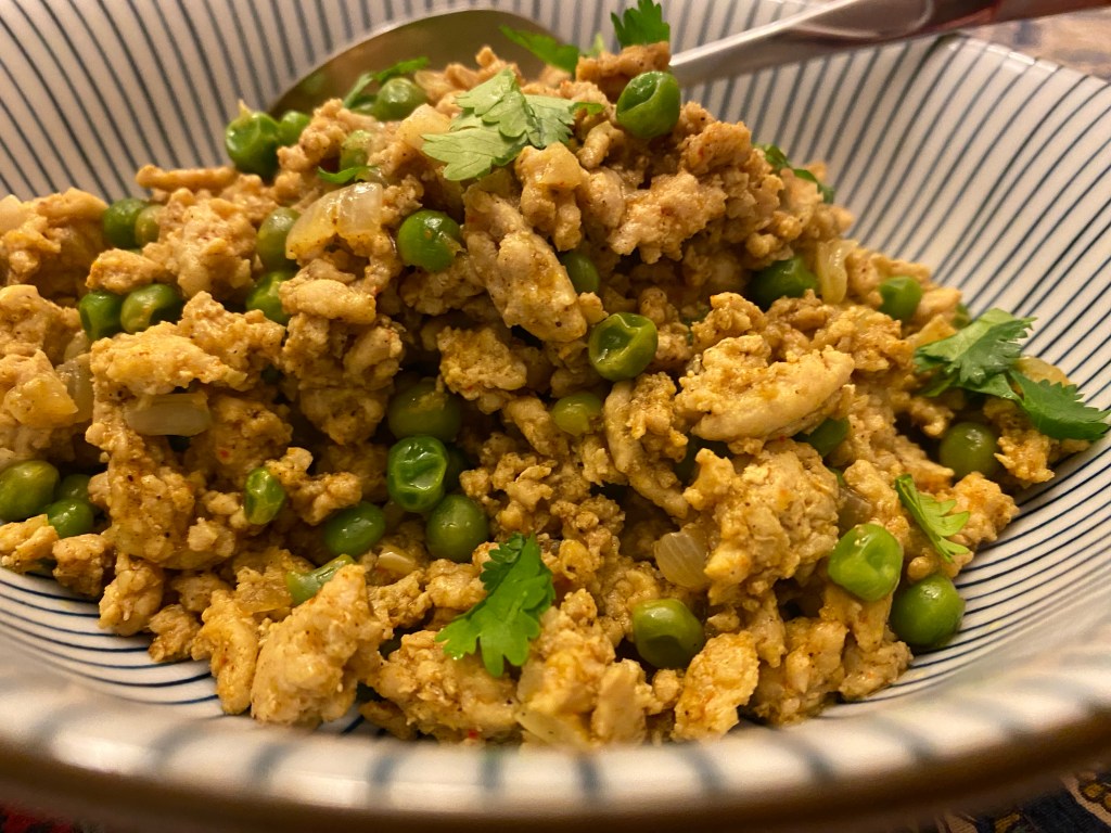 We tried a Madhur Jaffrey keema peas recipe using minced chicken (but we skipped the samosa): https://bigsislittledish.com/2011/01/03/turkey-or-chicken-keema-baked-samosas/ This turned out OK, but we prefer Shubhra Ramineni’s keema recipe (and there, we used minced turkey).
