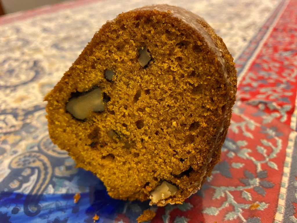 Our modifications: first, instead of making two loaves, we poured the batter in a bundt pan (with extra batter for a mini-loaf), each of which we lightly coated with ghee and a dusting of flour. Second, we added 3/4 cup chopped walnuts (lightly coated in 1 tsp flour) to the batter. Third, because we planned to glaze the cake, we reduced the white sugar from 2 cups to 1.5 cups to manage overall flavor balance. We baked at 350 for less than an hour (although due to an oven timer malfunction, we don’t have a precise time), once our toothpick came out clean.