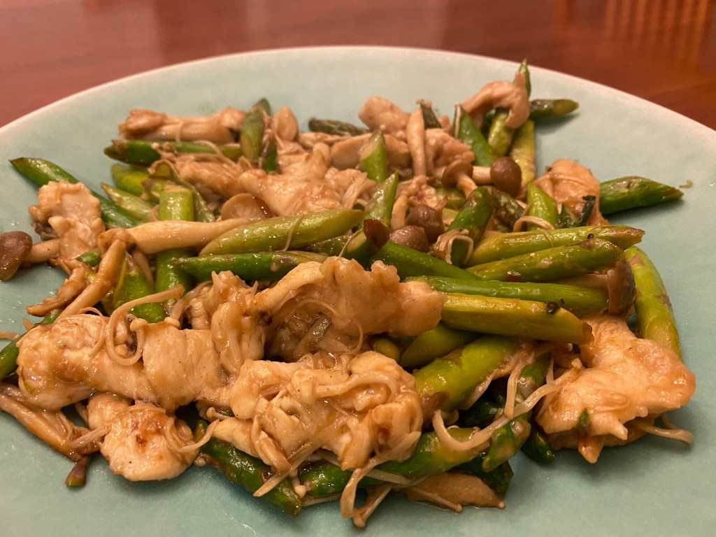 We followed the instructions but made protein and vegetable substitutions. First, we used 8 oz chicken cutlets (thinly sliced across the grain, approx. 1/8″ thick) instead of pork. Second, we dislike biting into ginger or garlic slices, so we microplaned both ginger and garlic. Third, instead of shiitake mushrooms, we used 2/3 bunch asparagus (cut into 3″ diagonals), which we sauteed on medium-high heat. Then after making sure the asparagus was tender, we folded in 1/2 bundle (about 1 cup) bonapi mushrooms (trimmed). One minute later, we folded in 1/2 bundle (about 1/2 cup) enoki mushrooms (trimmed). This was very tasty, and we enjoyed it. (Nov. 2023)