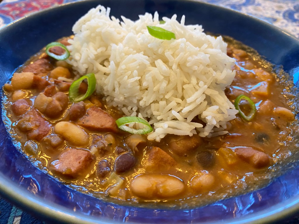 We do not have a slow cooker, so we made some modifications: first, following the bean prep instructions here (https://hurstbeans.com/recipes/15-bean-soup-with-smoked-sausage-swp) and we soaked the 20 oz Hurst’s dried beans overnight in 8 cups of water in the fridge (we set the Cajun seasoning packet aside). Second, the next day, we drained the beans, placed in a high walled Dutch oven, and added 1 quart no-salt chicken stock, 3 cups (not 4) of water, and 1 bay leaf. We brought to a boil, reduced to a simmer, and covered and simmered until the beans were tender. Third, once the beans were cooked, we added the Hurst Cajun seasoning packet but turned off the heat while we prepped the other ingredients. We sauteed the onion, celery, bell pepper, and garlic with some olive oil in a nonstick pan until the onion was translucent. Concurrently, in a separate pan we seared diced chicken andouille (we used six Gilbert’s andouille sausage, each cut into 1″ cubes, or 4 pie-shaped pieces per diagonal penny slice). To make sure the andouille browned, we seared them in 3 batches. We then added the sauteed aromatics and browned andouille to the Dutch oven, along with a 13.5 oz can of stewed tomatoes (we used Hunt’s). We folded all ingredients together. We added 2 tsp Cajun seasoning (McCormick’s) and 1 tsp Creole seasoning (Tony Chachere’s) for enhanced flavor and balance, and then let simmer for about 10 mins. We served this with a small scoop of basmati rice. This was a hearty and flavorful meal. (Feb. 2024)