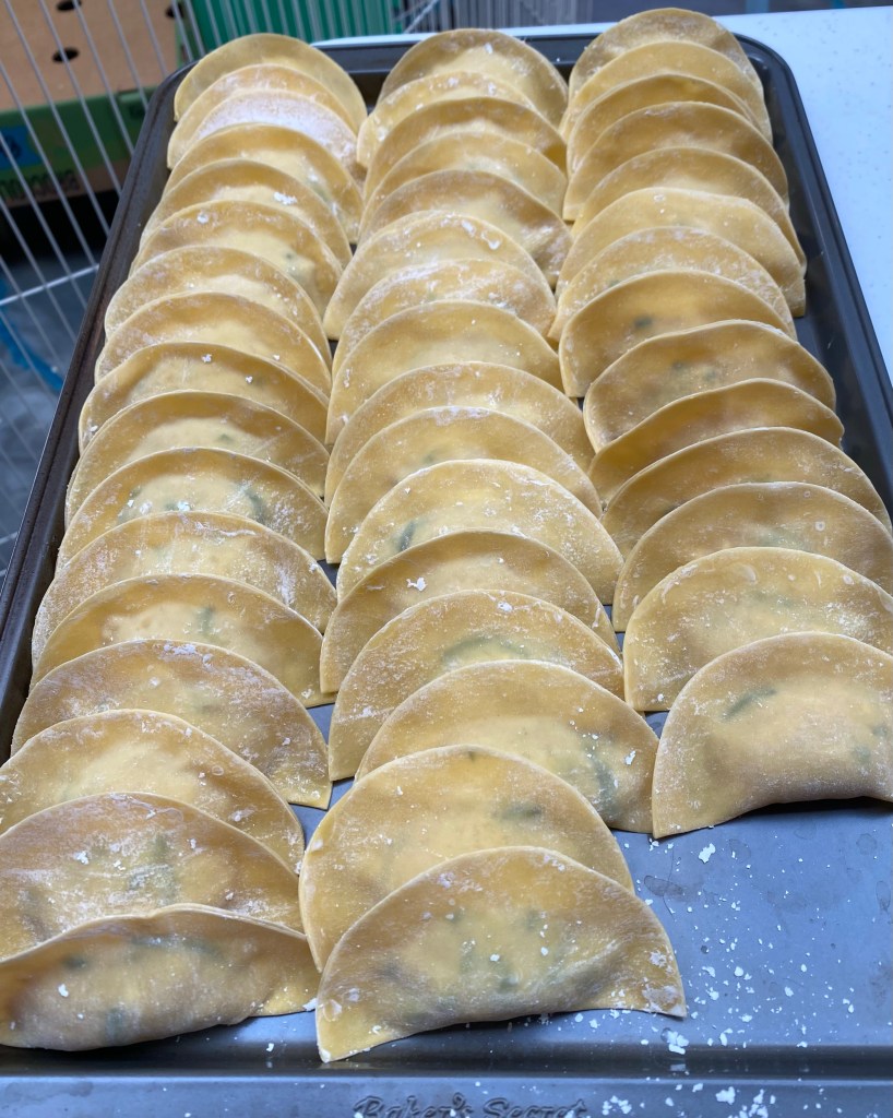 Here is the tray of chicken and zucchini mandu that we assembled at the party. We enjoyed reconnecting with friends and feasting on a wide variety of dumplings. (Feb. 2024)