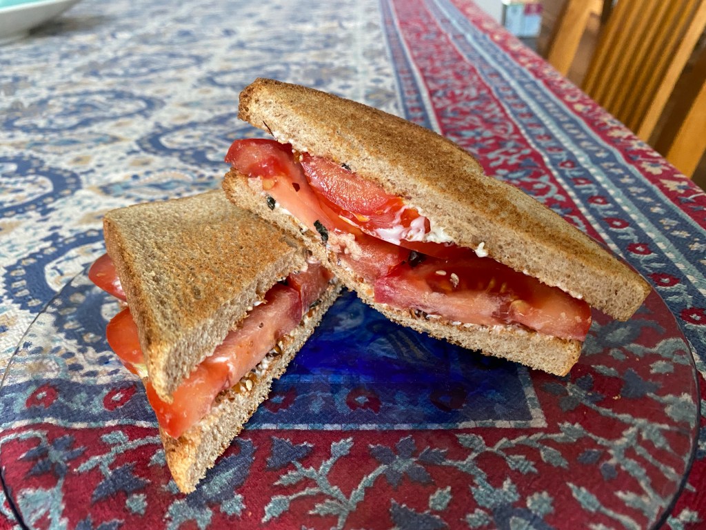 This is an easy shortcut that mimics a BLT: https://cooking.nytimes.com/recipes/1024442-furikake-tomato-sandwich?smid=ck-recipe-iOS-share. Very tasty. We applied only a thin layer of mayo. (Apr. 2024)