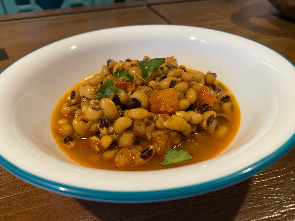 Add the drained black-eyed peas plus 2 cups water. Change Instant Pot setting to pressure cook – high for 12 mins, lock lid, and let cook without disruption. Once cooking is complete, let the contents do a natural release. Garnish with minced cilantro. Serve with basmati rice. (Apr. 2024)