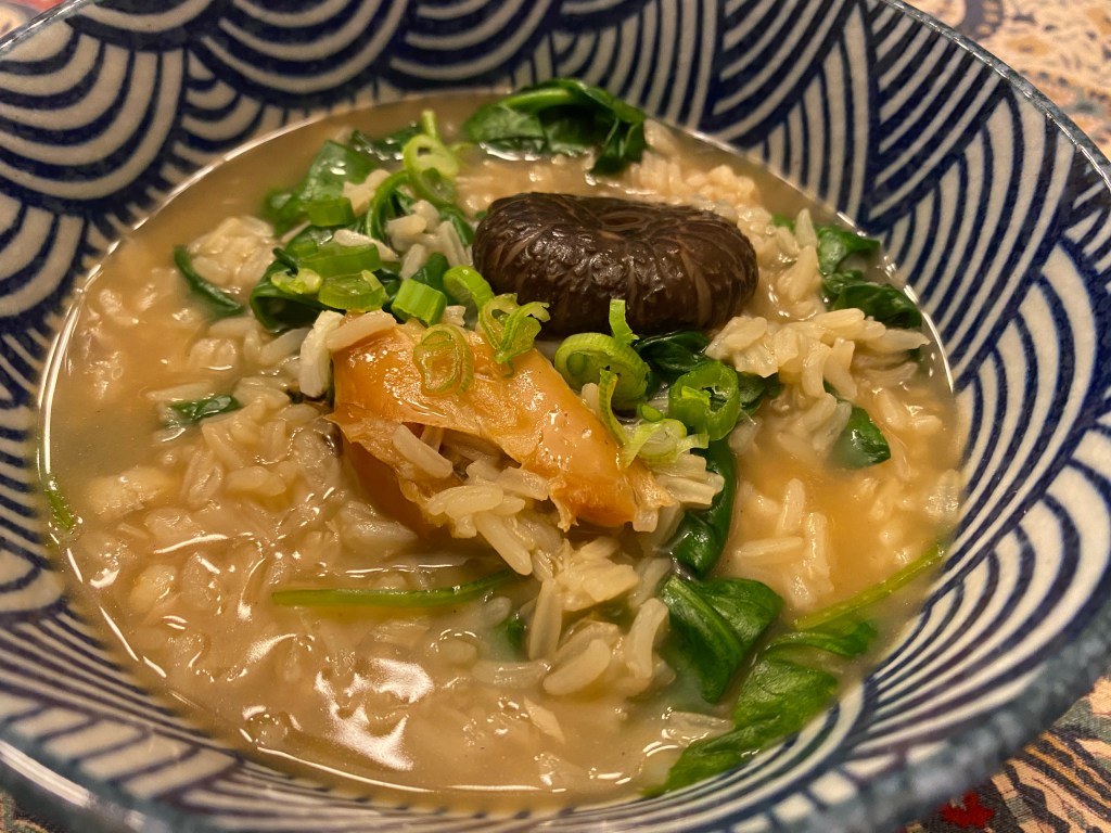 Our modifications: first, for the protein we used 4 oz Trader Joe’s smoked trout (i.e., 1 fillet), which we soaked in water for about 20 mins to reduce sodium. We then removed the skin and gently tore into 2-inch pieces by hand. Second, for the vegetable we used about 2.5 oz fresh baby spinach. Third, we added 1 dried shiitake to the simmering broth for umami. Fourth, we found the liquid to rice ratio resulted in a too-viscous congee; the next time we will use 6 cups liquid (4 cups no-salt chicken broth plus 2 cups water) for 3/4 cup uncooked jasmine rice, or 5 cups liquid for 1/2 cup rice. We also increased the heat to a rolling simmer, partially covered, in order to properly cook the rice. Finally, we found 1/4 tsp white pepper overpowering and will reduce to 1/8 tsp in the future. Upon serving, we garnished with finely diced scallion (its use wasn’t specified in the recipe). (May 2024)