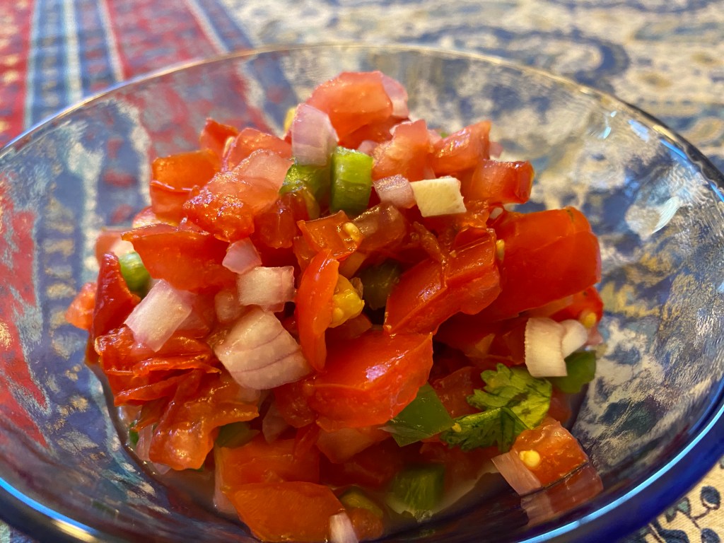 We used 3 vine-ripened tomatoes (seeds and liquid removed, then finely diced) plus about 1/2 cup cherry tomatoes from our garden (finely diced). We reduced the cilantro to 1 Tbsp. At the end of marinating the pico de gallo, we added a dash (about 1/2 tsp) of sugar and additional lime juice (about 1 tsp) for brightness. This was very tasty, and we enjoyed it with tortilla chips. (June 2024)