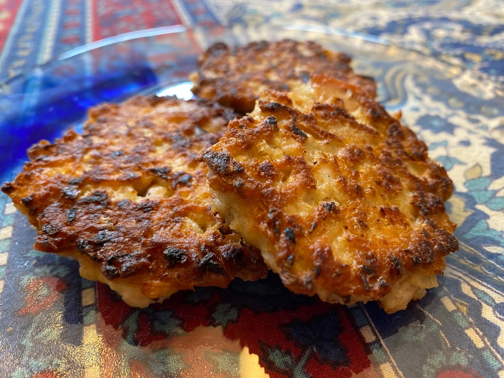 First, for the onion, we used a small shallot. To ensure the onion/shallot and garlic were finely minced, we used our Braun handheld mixer. Second, it’s important to drain the tuna as thoroughly as possible (we save the tuna brine as a treat for our cat). Third, we recommend reducing the salt by at least half (maybe to 1/2 tsp or less). Even with no-salt tuna, we found the recipe a little salty, although quite tasty.