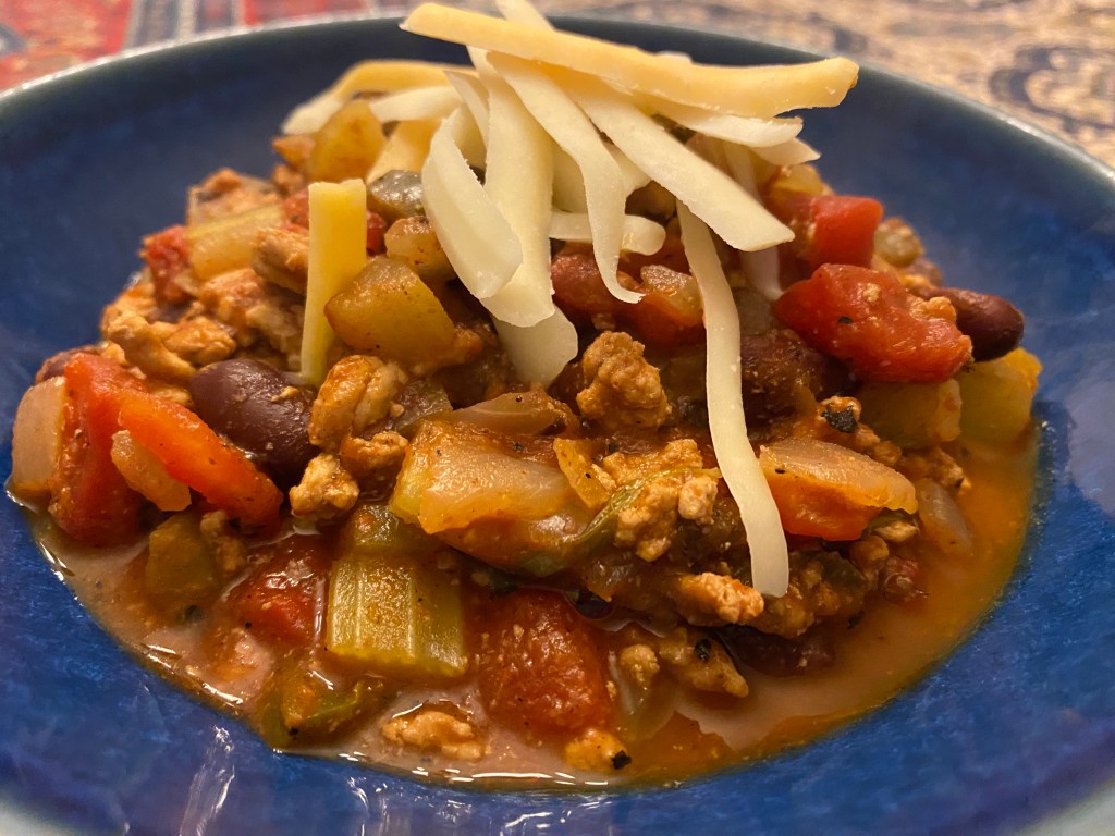 Our modifications: first, we halved the recipe. Second, in lieu of bell pepper plus jalapeño pepper, we used three diced jalapeños (from our freezer). Third, we used no-salt canned diced tomatoes and kidney beans. Finally, in addition to the spices in the recipe, we added 1/4 tsp each cinnamon, coriander, and smoked paprika as well as 1/8 tsp unsweetened cocoa powder. Towards the end, we added a dash each sugar and salt. (Nov. 2024)