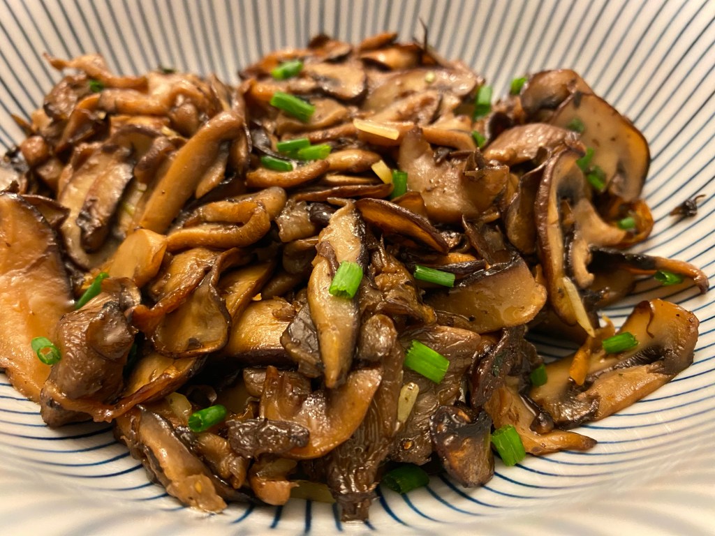 For the mushrooms, we used 8 oz Smallhold Umami Mushroom Pack (royal trumpet / king oyster, shiitake, and blue oyster), 8 oz cremini, and 3.5 oz shiitakes (we went over 2 lbs). We removed the stems and thinly sliced the mushrooms caps (1/8” thick). We generally followed the instructions except we reduced Parmesan to about 1 tsp shredded. We agree with the author that the 2 Tbsp soy sauce enhances the unami flavor.