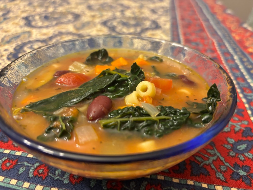 The soup turned out well overall. Our modifications: first, we used lacinato kale, stems removed and hand-torn. Second, we found the soup too chunky (esp. with the 3/4 cup ditalini pasta) and added an extra half-cup of chicken broth to make it brothier. The next time, we’ll probably cook the pasta separately and add to the soup bowl when serving. Finally, we balanced the flavors in the end with a dash each of salt and sugar. This overall was a satisfying dish. (Apr. 2025)