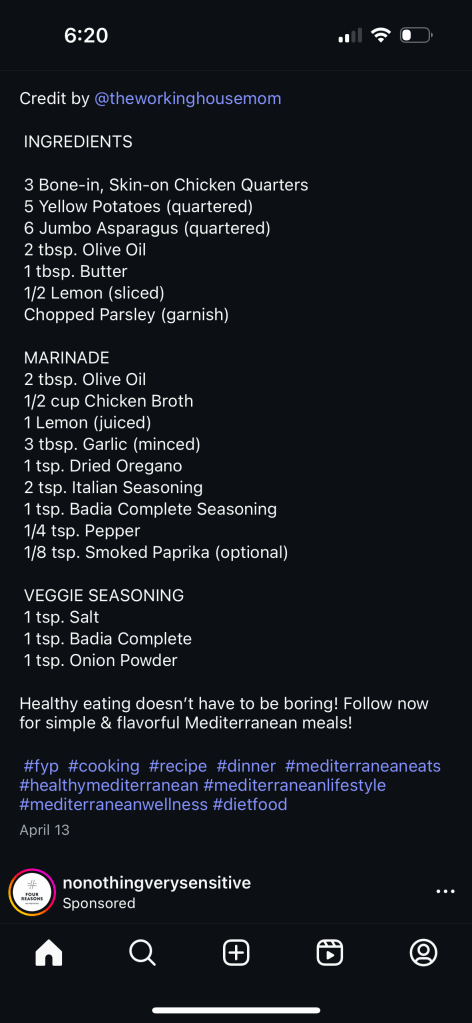 The instructions were scant (and sometimes inconsistent with the video), but we followed the ingredient list in the second photo (below). Our modifications: first, due to our overly sensitive smoke alarm, we used canola oil instead of olive oil based on our overly sensitive smoke alarm. Second, we marinated the chicken quarters for an hour (not 20 mins). Third, we increased the oven temp to 425. Finally, because our asparagus was not jumbo and was thin as reeds, we added them about halfway through the 40-min baking time. This was very tasty. (May 2025)