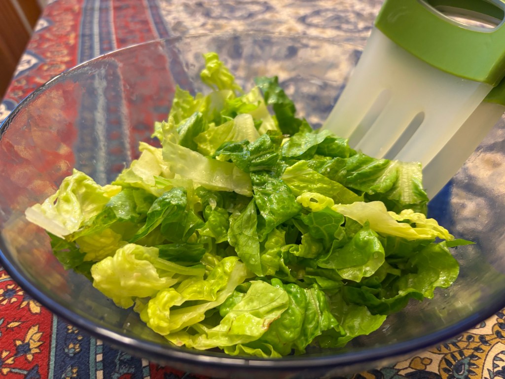 We made this simple salad to accompany soy-honey chicken drumsticks and jasmine rice. The recipe was simple, with a light hand at dressing: https://www.allrecipes.com/recipe/281305/simple-romaine-salad/ (July 2025)
