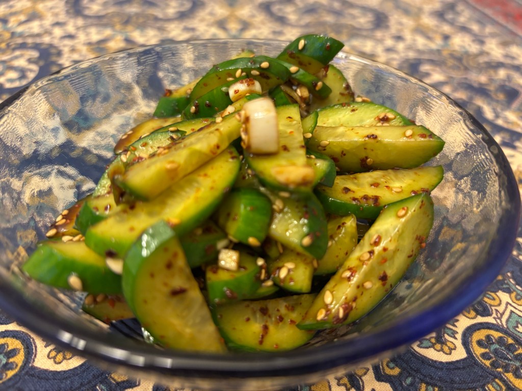Our modifications: first, we used 3 Persian cucumbers instead of 1 English cucumber. Second, we omitted the onion. Finally, we added the optional ingredient, about 1 tsp sugar. This was a quick and tasty recipe, probably our favorite version of this Korean cucumber dish. (July 2025)