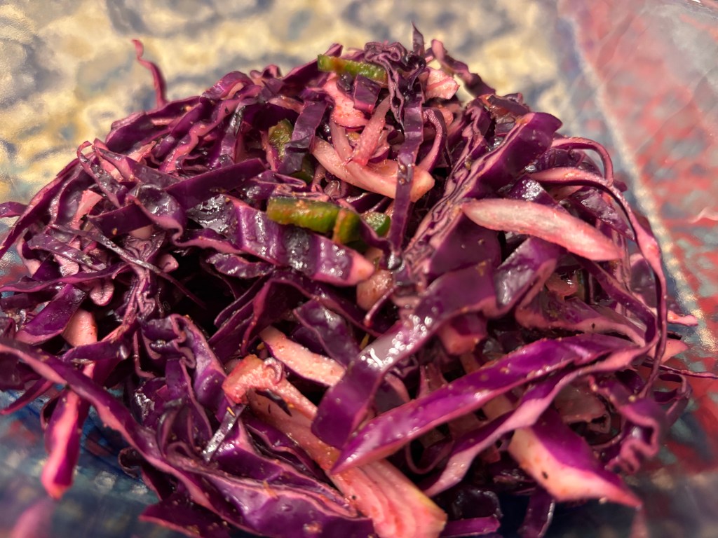 We made this cabbage slaw by Feasting at Home: https://www.feastingathome.com/mexican-slaw/ This was very tasty, and we definitely will make it again. But the next time we may try to slice the cabbage with a mandolin.