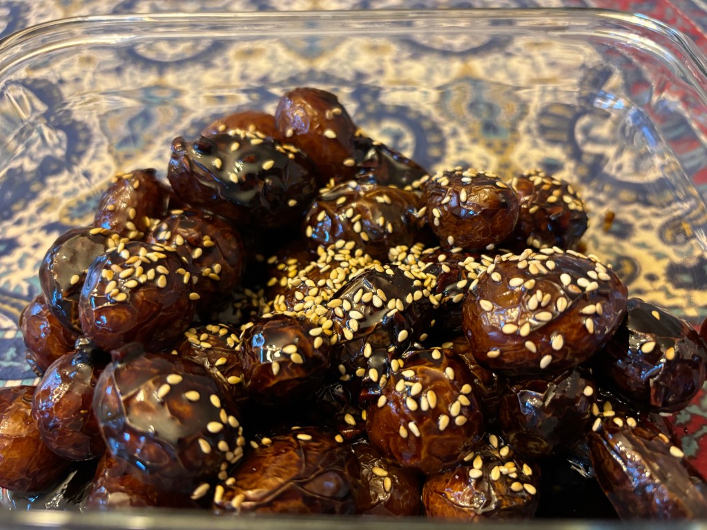 Our modifications: first, we did not have rice syrup. To mimic its flavor, we used a combination of molasses, honey, and maple syrup (in equal parts). Second, we had 1.5 lb tricolored baby potatoes, so we adjusted the recipe’s proportions to 1.5 of Maangchi’s recipe. The next time we make it for a group event, we will make at least 2 lb baby potatoes.