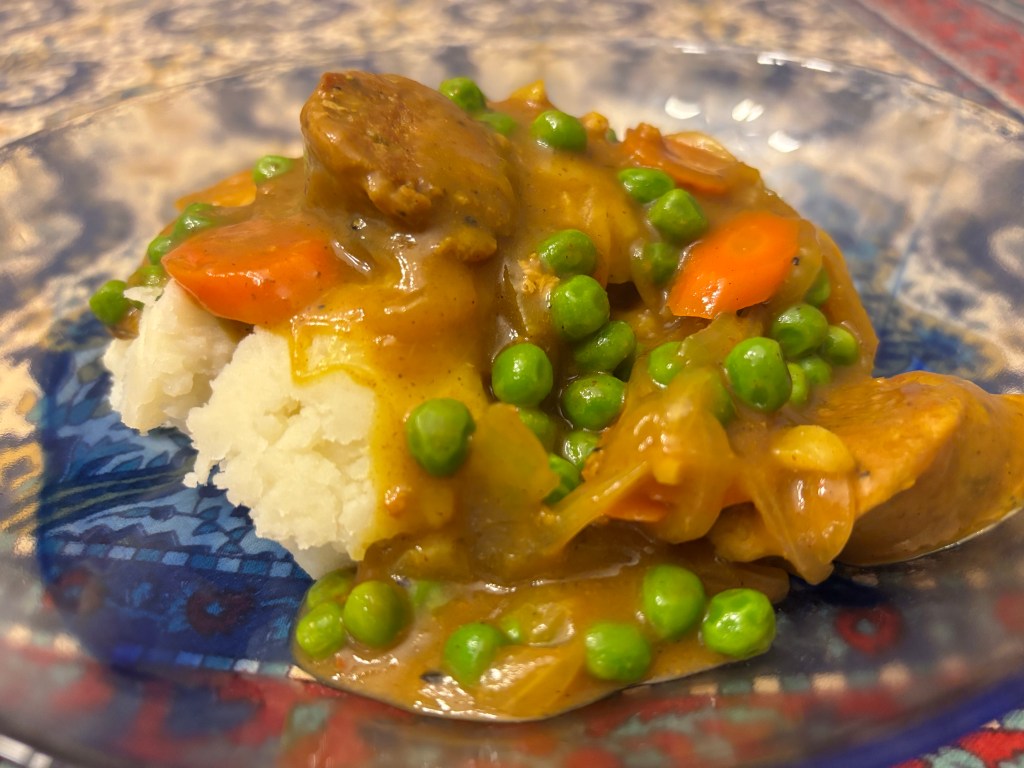 The curried sausage’s gravy went very well with mashed potatoes (https://piglettedc.wordpress.com/2022/08/15/chef-johns-classic-mashed-potatoes/). (Aug. 2025)