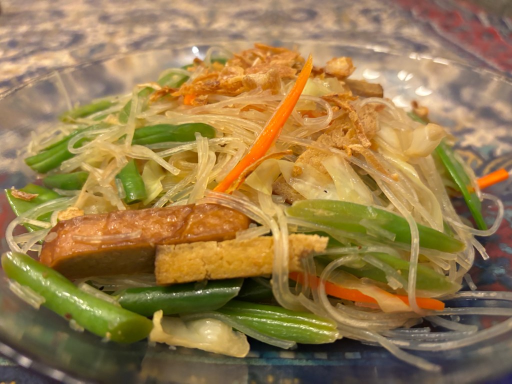 We were in search of a vegetable-heavy Filipino dish, so we tried this wonderful, healthy recipe for sotanghon guisado by Filipino-American food blogger Liza Agbanlog. Although her recipe calls for 2 chicken thighs, we used 6 oz smoked pressed tofu (specifically, Kong Kee brand in a red and white label), patted bone dry, and cut into 1/2″ thick matchsticks.