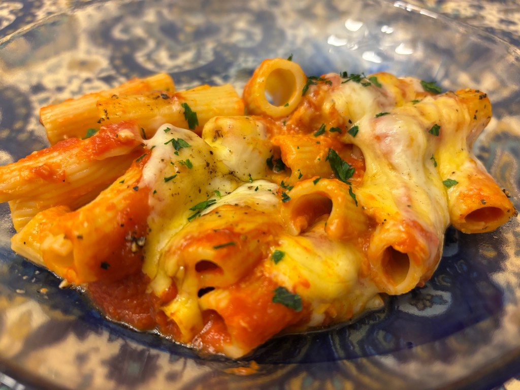 We had a craving for baked ziti, but we had limited ingredients in our pantry – 1 lb uncooked ziti, Rao’s marinara sauce, and some cheese. We tried this simple recipe that doesn’t use ricotta cheese or heavy cream: https://asimplepalate.com/blog/easy-baked-ziti/