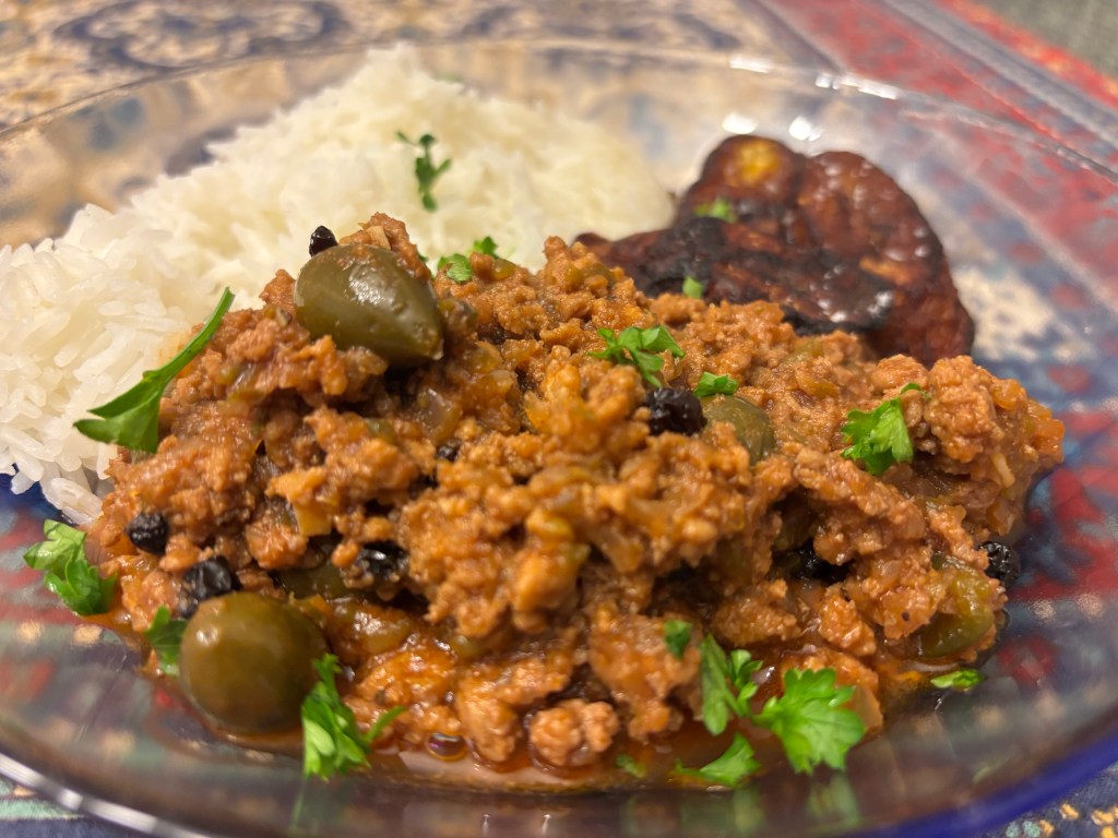 We served this picadillo with jasmine rice and fried sweet plantains (maduros). The caramelized maduros were a wonderful complement to the briny notes of the picadillo. (Oct. 2025)