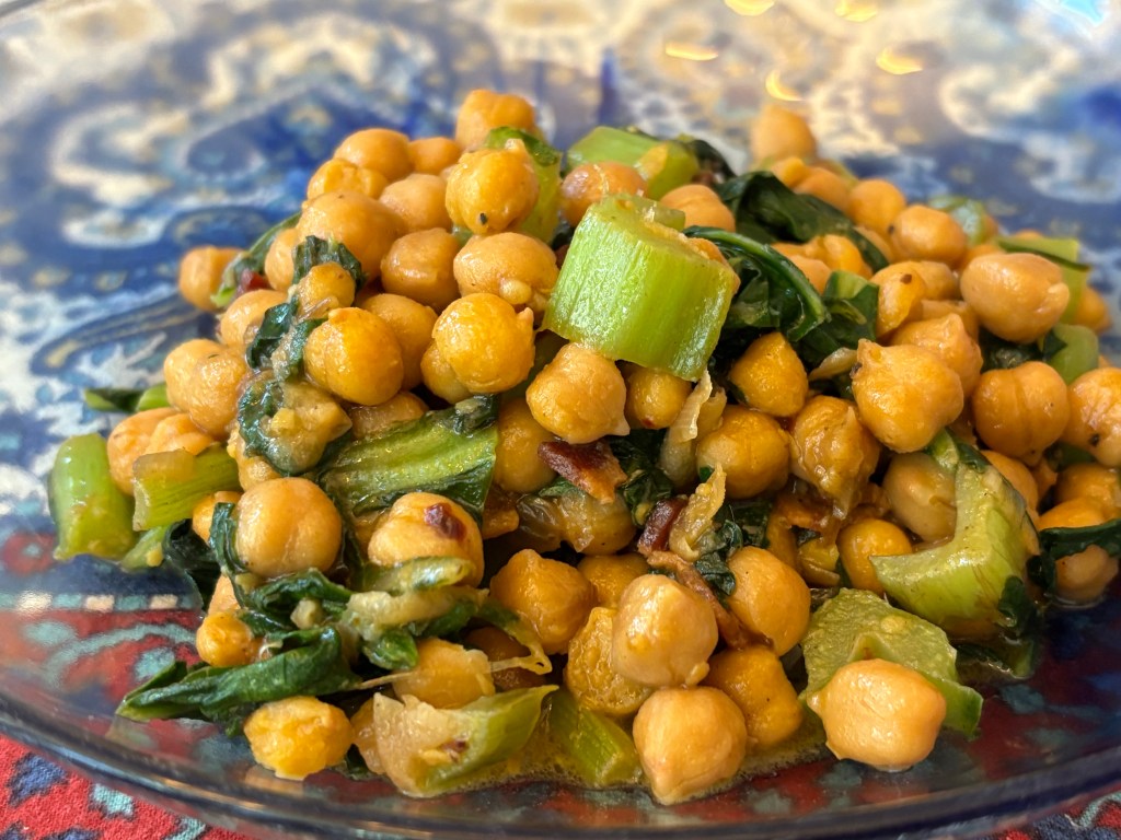 This is an easy recipe with surprisingly complex flavors: https://www.thekitchn.com/recipe-swiss-chard-with-garbanzo-beans-249801. The crunch of the Swiss chard steps reminded us of celery without the sharp flavor.