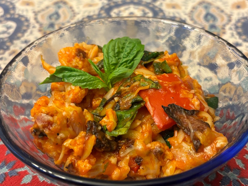 Finally, we folded in 8 oz shredded mozzarella, and then sprinkled 1/3 cup grated parmesan on top. We covered the casserole dish with foil, then baked until the orzo was at dente (about 25 mins). (Mar. 2026)