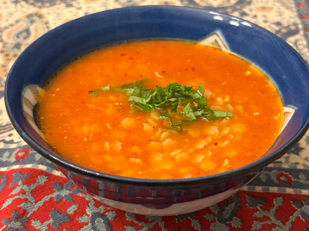 Note: The next time, we may either reduce the shredded parmesan to 2 Tbsp or add a parmesan rind instead at an earlier stage (along with the pureed tomato, broth, and water).