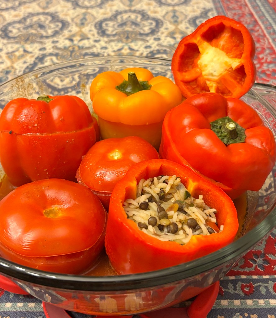 Third, we could not fit all of the stuffed vegetables in one baking dish. Instead, we used two round, deep dish (2 quart each) casserole dishes with lids. We fit 4 bell peppers and 1-2 tomatoes in each casserole dish. We placed each covered casserole dish on its own foil-lined rimmed baking sheet and baked at 360 degrees F (per the blog post) for 45 mins. Then kept them covered to steam for 10 mins.