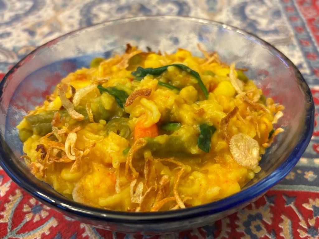 Our modifications: first, for the 4 cups of vegetables, we used 3 cups frozen mixed vegetables. We also used about 2 oz of fresh baby spinach, which we added after the khichdi had finished cooking. Second, we did not have fresh tomatoes, so we used 1 cup canned diced no-salt tomatoes. Finally, when serving, we garnished with fresh cilantro and with fried shallots for mouthfeel. (Feb. 2026)