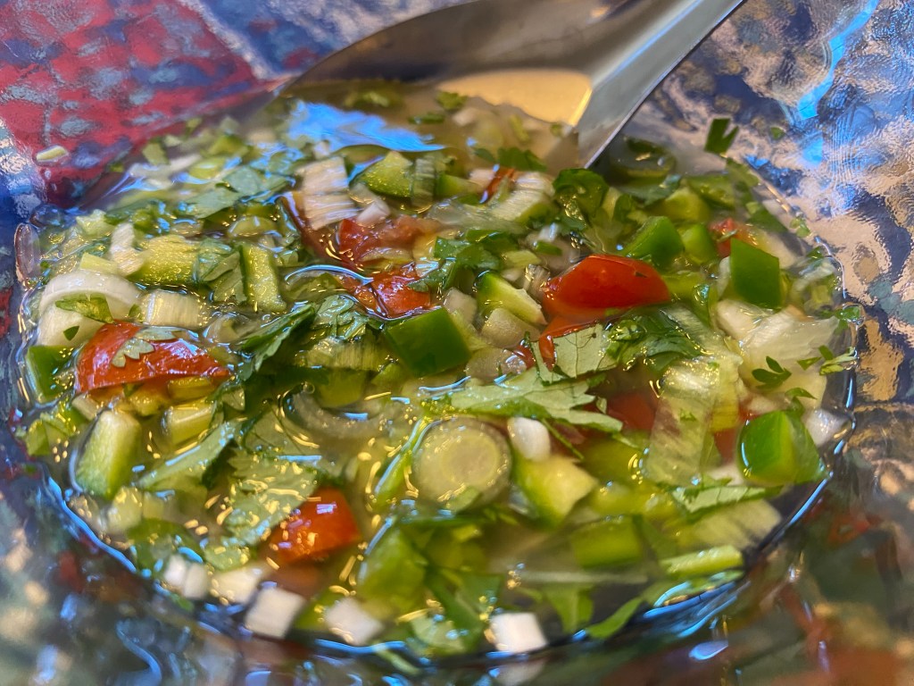 Finally, we garnished with hardboiled egg (1/2 egg per serving) and aji (we made this recipe: https://piglettedc.wordpress.com/2024/09/08/colombian-aji-fresh-condiment/). We almost skipped the aji, but it provided refreshing brightness and balance to the soup (so we highly recommend it). We omitted the avocado this time.